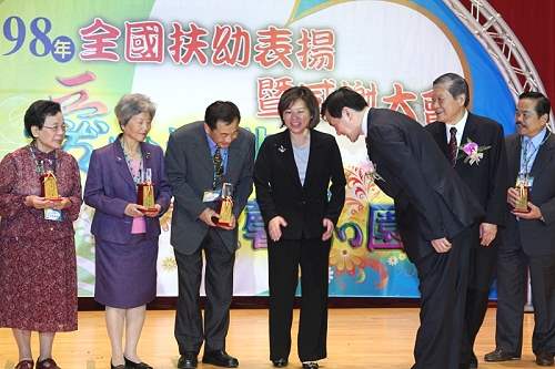 馬英九總統今天下午前往嘉義出席由財團法人台灣兒童暨家庭扶助基金會舉辦的98年全國扶幼表揚暨感謝大會,對家扶基金會志工及認養人犧牲奉獻與關懷孩童的表現,表達高度肯定之意,並代表主辦單位頒發獎牌表揚「30年國內兒童認養人」。