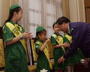 今天,阿扁很高興能夠在總統府與童軍伙伴們見面,在此向各位表達問候與歡迎之意,同時,也對大家長期以來為國家社會,甚至遠赴世界各地奉獻服務的精神,表示嘉勉與感謝之意。