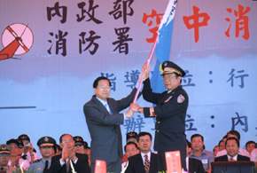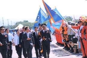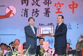 陳總統水扁先生今天上午前往台東縣主持內政部消防署空中消防隊暨特種搜救隊成軍典禮,除校閱地面與空中分列式外並親自授旗,另外,也接受內政部部長余政憲呈獻直昇機模型。