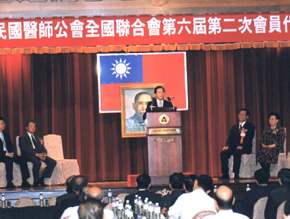 中華民國醫師公會全國聯合會是我國所有執業醫師依法均須加入的職業團體,目前會員達三萬多人,可以說是台灣醫界的大家庭。自民國十九年成立以來,以聯合全國醫師,增進醫療技能,協助推行社會服務,並謀求醫療業務發展為宗旨,多年來在歷任理事長的帶領及全體會員的努力下,積極配合國家醫療政策,致力提升國內醫療品質與維護國人身心健康,成效卓著,令人敬佩。今年五月,貴會更在吳理事長及各位會員的努力下,配合政府,積極參與推動加入世界衛生組織的工作。雖然因為國際社會現實及中共的強大壓力,我國加入世界衛生組織再度叩關失敗,然而,阿扁相信以台灣先進的醫療衛生水準及品質,只要我們鍥而不捨,全力以赴,一定能繼今年元月一日加入世界貿易組織成功之後,順利達成進入世界衛生組織的目標。