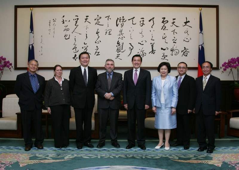 保羅克魯曼博士下午由中華經濟研究院董事長朱敬一、台灣金控董事長張秀蓮陪同,前來總統府晉見總統,國安會秘書長蘇起也在座。