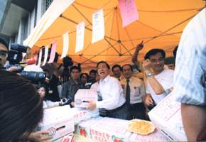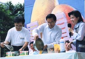 陳總統水扁先生今天下午應邀參加「黃金戀曲芒果香—和台南芒果戀愛一夏」活動,也和台南縣蘇煥智縣長在指導人員解說下,一起DIY做芒果布丁,總統邊做邊說,他所做的芒果布丁有媽媽的味道,有台南的味道,更有台灣的味道,隨後並在蘇縣長的陪同下到各個展售攤位品嚐各種類新鮮芒果及加工食品,對於台南縣高品質的芒果總統是讚不絕口,更現場協助果農販售。