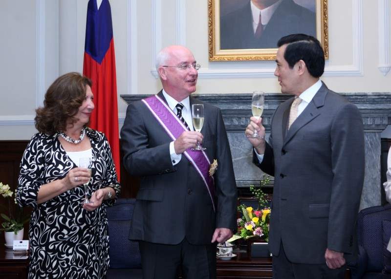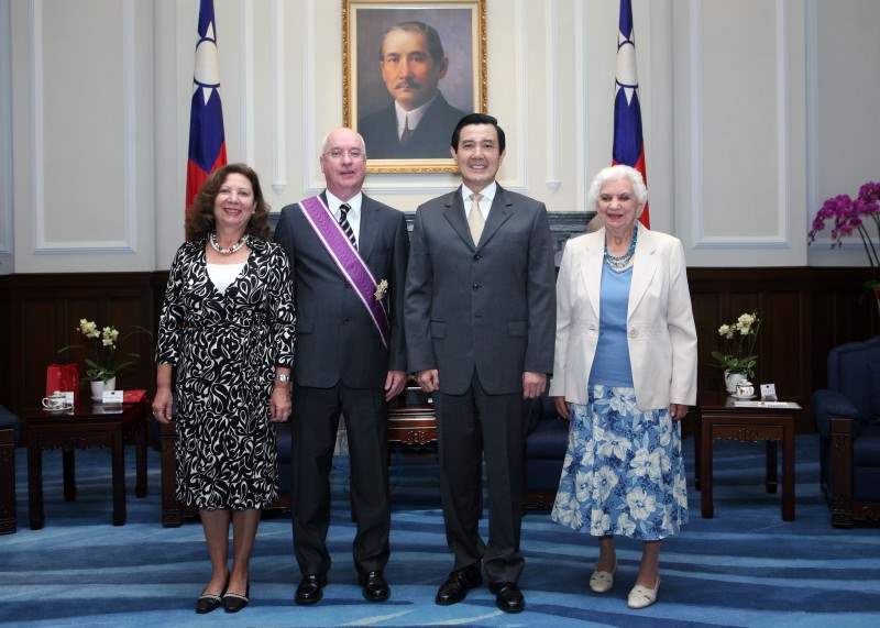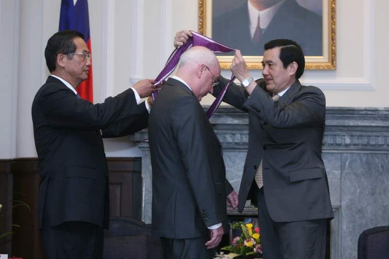 馬英九總統今天上午代表中華民國政府與人民頒贈台北歐洲學校總校長倪克森(John Nixon)紫色大綬景星勳章,以表彰他多年來致力提升台歐文化交流的卓越貢獻。