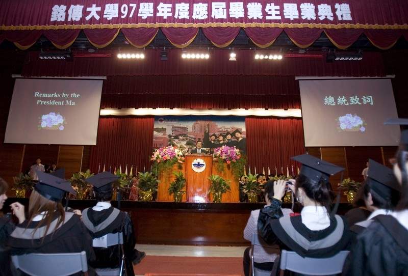 馬英九總統今天晚間前往銘傳大學桃園校區出席該校97學年度畢業典禮,除為榮獲「五育全能獎」及各學院第一名的畢業學生頒獎,並致詞祝福畢業生「鵬程萬里、一飛沖天」。