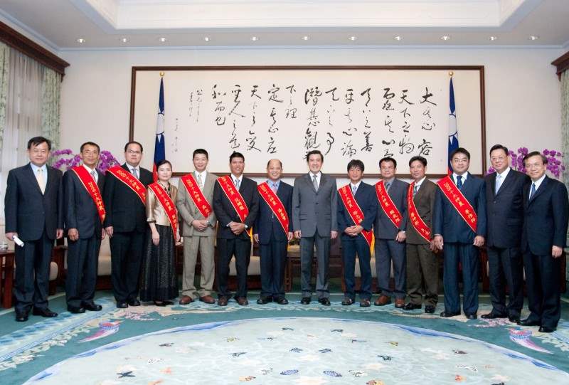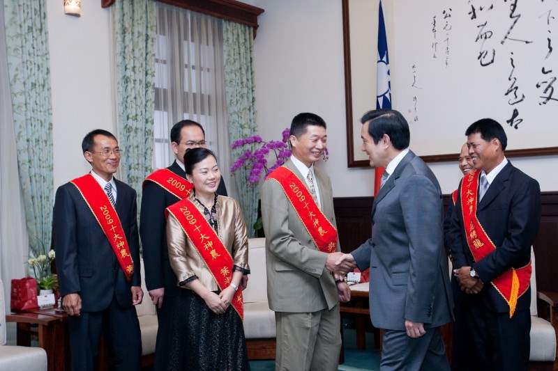 2009年十大神農獎得獎人湯嘉豐、范銹龍、吳文元、葉淑盆、王益豐、李惟裕、黃進文、徐志雄、廖坤郎及賴兆炫等下午由農委會副主委黃有財陪同,前來總統府接受總統道賀。總統府副秘書長賴峰偉也在座。