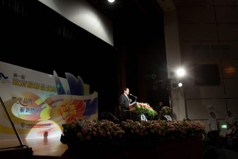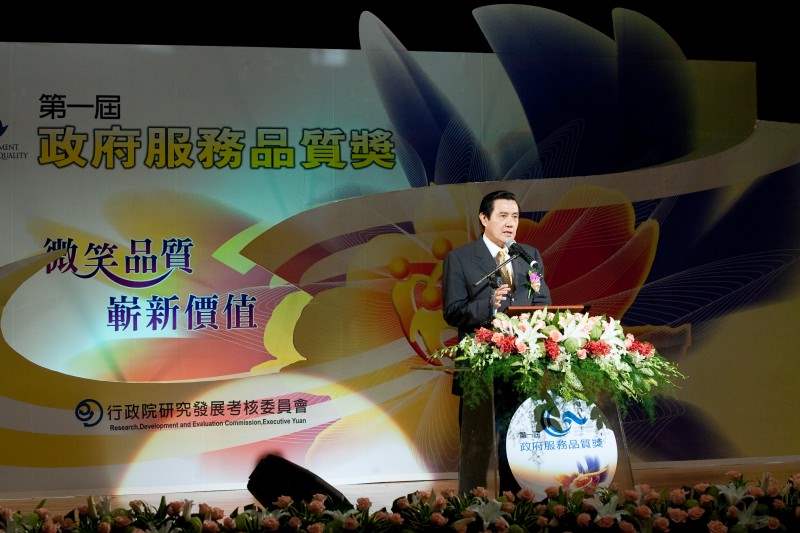 馬英九總統今天下午出席行政院研考會在台北市公務人力發展中心舉辦的第一屆「政府服務品質獎」頒獎典禮,除了肯定24個得獎單位在創新服務方面所做的努力,也勉勵所有政府單位一起努力,提升服務品質,讓民眾感受到政府的用心與創新。