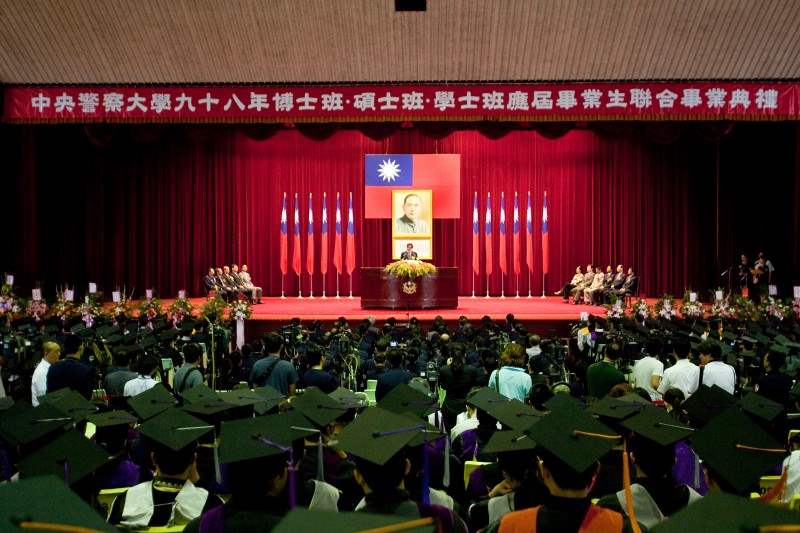 馬英九總統今天上午獲邀主持中央警察大學98年畢業典禮,頒發各系組畢業生第一名獎牌及畢業生代表畢業證書,並致詞提出「清、慎、嚴」的概念,期勉所有畢業生都能清廉自持、慎重保障人權、嚴格維護治安。