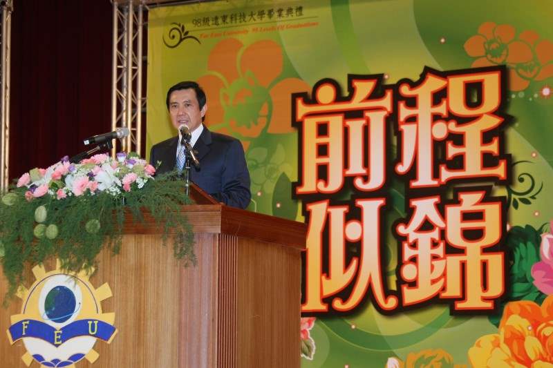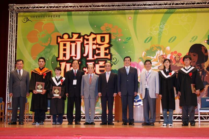 總統表示,很高興能見證現場2000多位畢業生的重要時刻,除向大家說聲恭喜之外,也感謝學校、師長及家長為學子提供良好的學習環境,為社會培養人才。對於去年金融海嘯造成許多家庭生活困難、很多同學面臨繳不出學費的問題,遠東科技大學實施「私立大學、公立學費」政策,讓同學能夠負擔學費,總統表達欽佩之意。