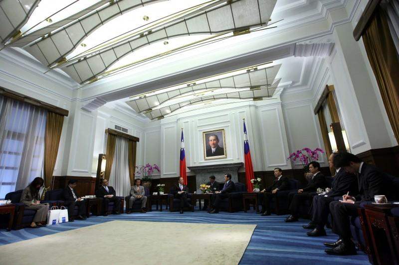 日本貿易振興機構(JETRO)理事長林康夫,上午由日本交流協會副代表田邊正美、我外貿協會董事長王志剛、經濟部次長鄧振中陪同,前來總統府晉見總統,國安會諮詢委員楊永明也在座。