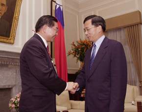 陳總統水扁先生今天下午接見世界台灣商會聯合總會會長廖靜錄暨幹部團成員,對於台灣商會聯合總會幹部們放下身邊事業,從各地遠道而來,以具體行動表達對國家的熱愛及支持,總統表達誠摯的歡迎及敬意。