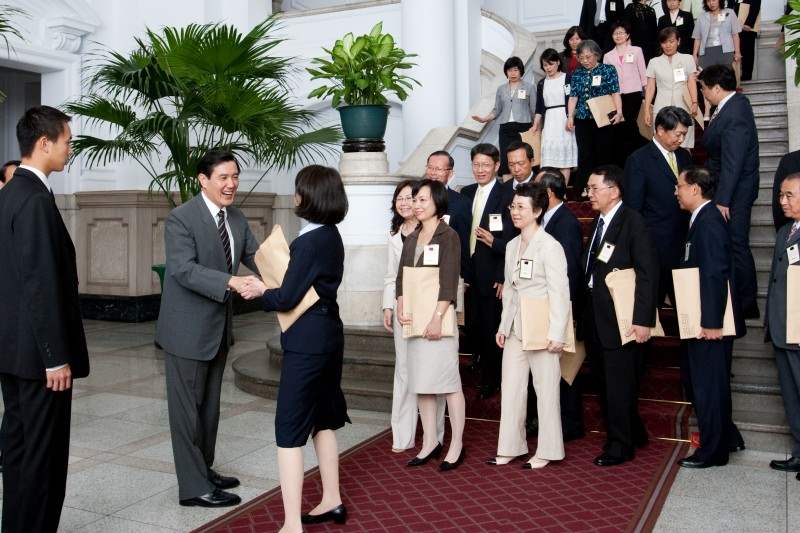 「國家發展研究班」及「女性領導發展研究班」各期學員代表,下午由行政院副院長邱正雄、行政院研考會主任委員江宜樺、人事行政局局長陳清秀陪同,前來總統府出席座談會,總統府副秘書長賴峰偉也在座。