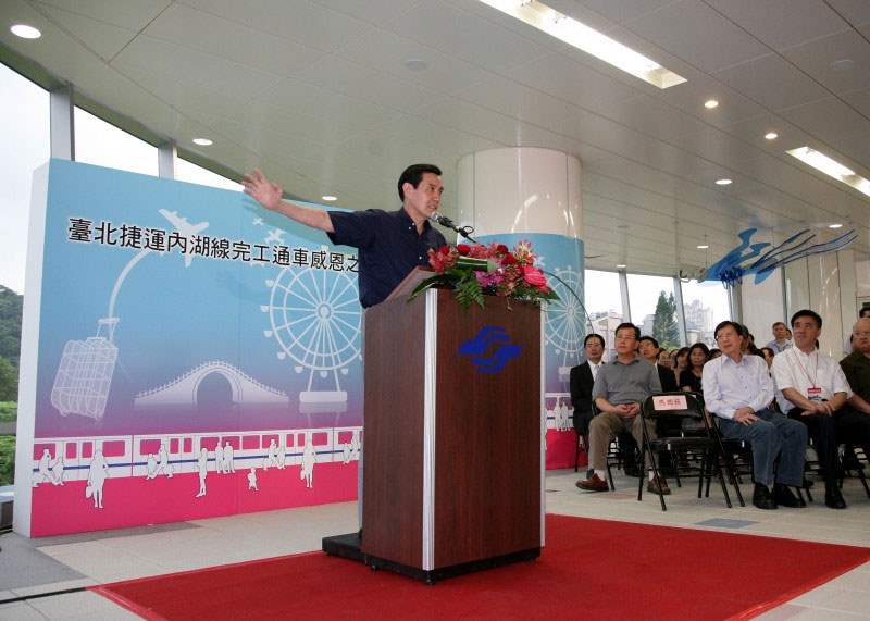 總統在返回大湖公園站下車後,繼陪同的台北市郝龍斌市長及行政院劉兆玄院長後,應邀致詞,感謝所有參與單位長時間的辛勞,以及沿線居民的合作,讓內湖線順利完工,相信對大台北地區的交通將帶來更大的便捷。