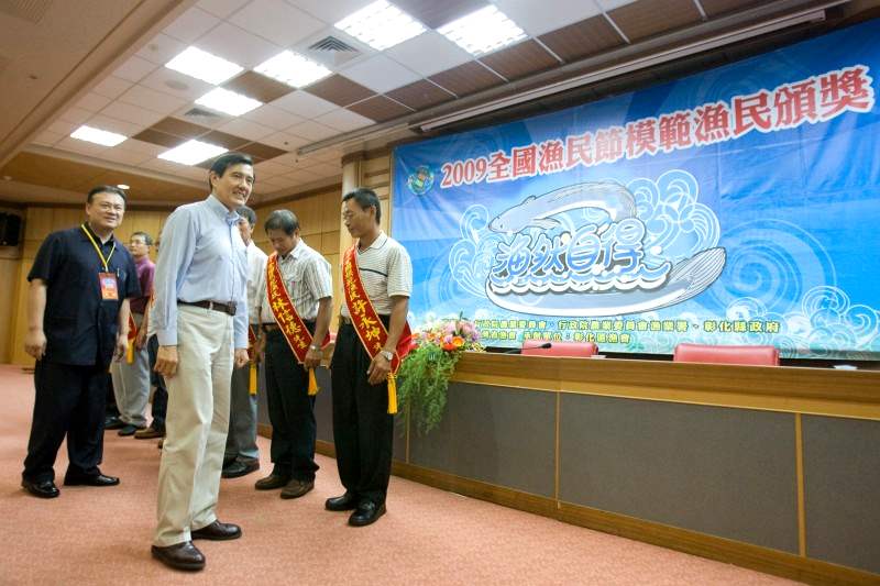 馬英九總統今天中午南下彰化出席「2009全國漁民節暨模範漁民頒獎典禮」,除頒獎給12位全國模範漁民,並致詞說明他上任以來推動漁業政策的各項重大措施與願景,強調政府會永遠與漁民站在一起,照顧漁民的生計。
