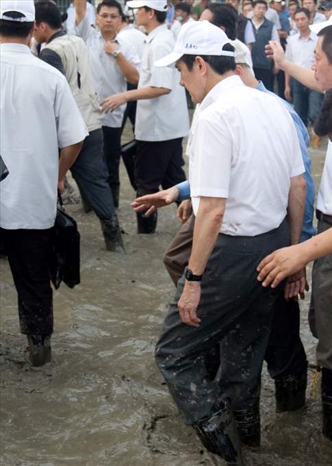 總統在捻香悼念後,在致詞之前,特別引領陪同首長再次向災民鞠躬致意,鄭重地表達政府的歉意。總統說,他以中華民國總統的身份,向大家表示最誠摯的歉意,「我們保護不周、照顧不夠,讓災民受苦受難,政府要在這裡,再度道歉!」