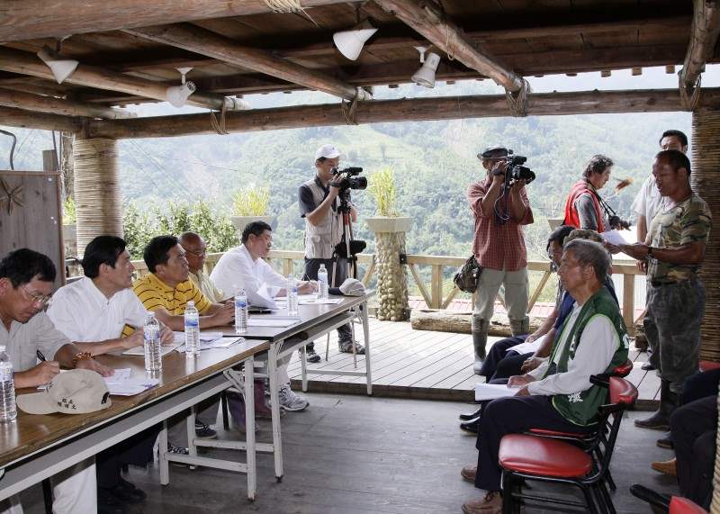 馬英九總統今天上午前往嘉義縣梅山鄉太和村、阿里山鄉里佳村及番路鄉大湖村視察災區及探視災民,並在座談會中聽取災民有關安置與重建工作的意見。