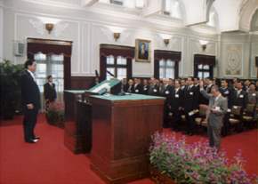 在唱國歌及向國旗暨國父遺像行三鞠躬禮後,首先舉行宣誓典禮,宣誓人國防部副部長康寧祥,在總統監誓下,面對國旗、國父遺像,高舉右手,宣讀誓詞。儀式莊嚴隆重。