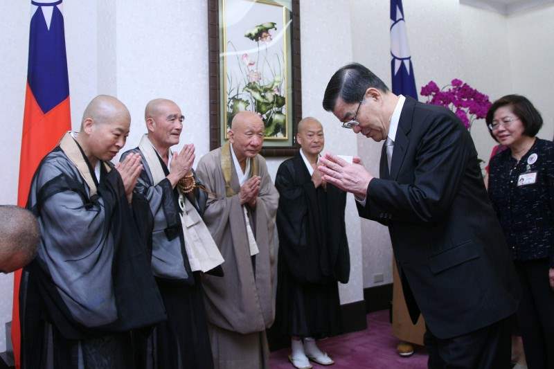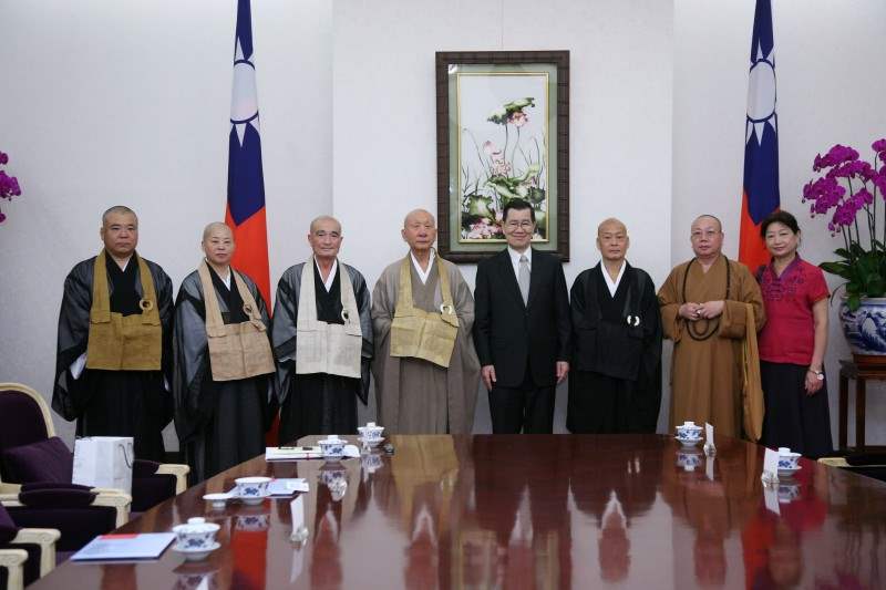 日本京都府靈雲院國際禪交流友好協會之日本貴賓,包括則竹秀南(NORITAKE SHUNAN)理事長、長門義明(NAGATO GIMYO)理事、久下保健(HISAKA YASUNORI)專務理事、岡島南圭(OKAJIMA NANKEI)理事、金泉照玉(IMAIZUMI YOGYOSI)事務局員等5人,上午由台北市政府民政局局長黃呂錦茹、台北市十普寺悟潔法師等人陪同,前來總統府拜會副總統。