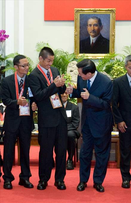 「2009臺北聽障奧運會」中華代表隊得獎選手及教練上午由行政院體育委員會主任委員戴遐齡、台北市長郝龍斌陪同,前來總統府接受總統道賀,總統府副秘書長賴峰偉也在座。