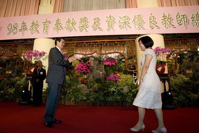 馬英九總統今天上午前往陽明山中山樓出席「98年教育奉獻獎暨資深教師表揚大會」,與獲獎教師一一合影留念,並致詞感謝他們作育英才無私的情操與奉獻。