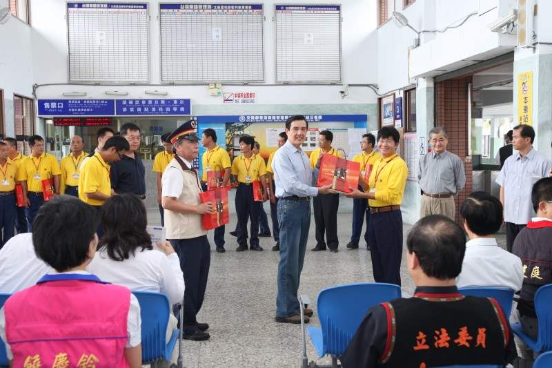 總統上午在交通部長毛治國、外交部長楊進添、縣長鄺麗貞等人陪同下,先前往太麻里車站慰勉台鐵工作人員。台鐵南迴鐵路太麻里段地基,在88水災時被沖走 1公里長,由於工程困難度高,原訂需要 2個月的時間完成修復,但台鐵提前1個月搶修完成,總統除表示肯定與嘉勉外,並致贈秋節加菜金及月餅,祝福大家中秋佳節愉快。