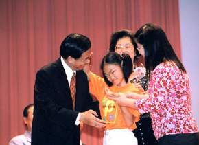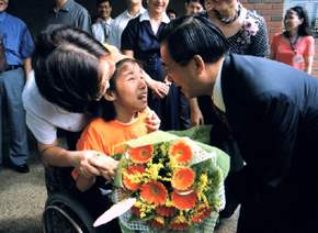 陳總統水扁先生今天上午前往參訪台中縣私立惠明學校,受到全校師生熱烈的歡迎,日前以點字寫信邀請總統到訪的李美娟同學,也代表致贈總統陶藝作品,以表歡迎之意。另外,國小三年級的視、聽障學生劉育伶小朋友,因為看不到總統,也聽不到總統講話,所以特別在總統的手上以手指語表達感謝總統到訪看望、關心大家;並且以手摸觸總統的頭髮、五官,達成他要好好「認識」、「看看」總統的願望。總統在致詞時則期勉大家要把種種的「不可能」完全撇開,明確的告訴自己,生命是永遠充滿著希望與期待,生命的光亮要由自己去點燃。