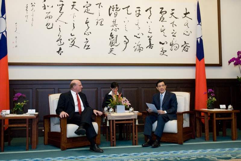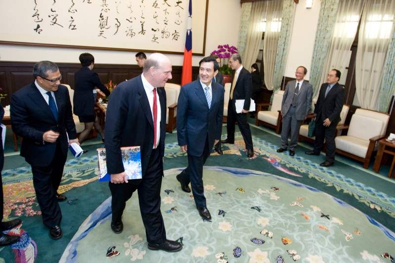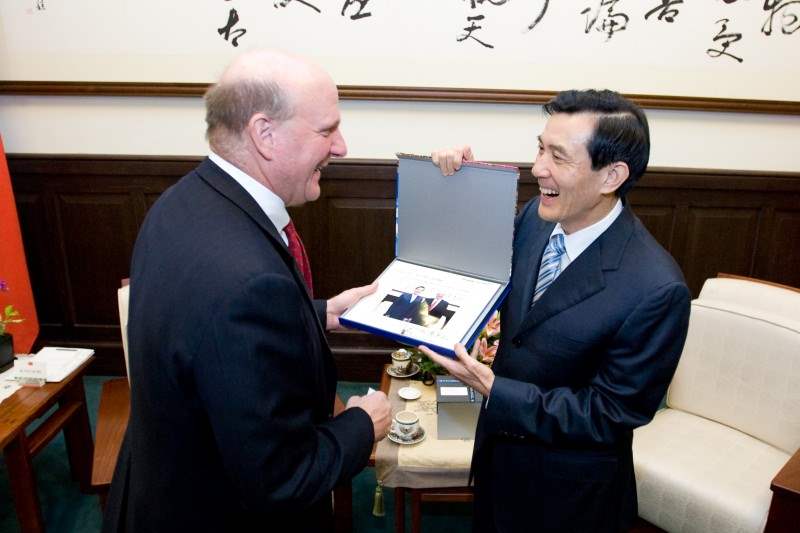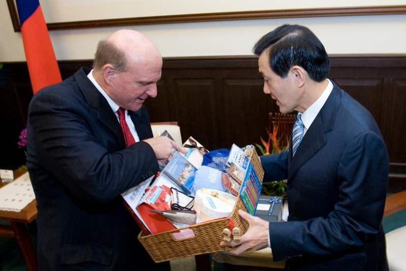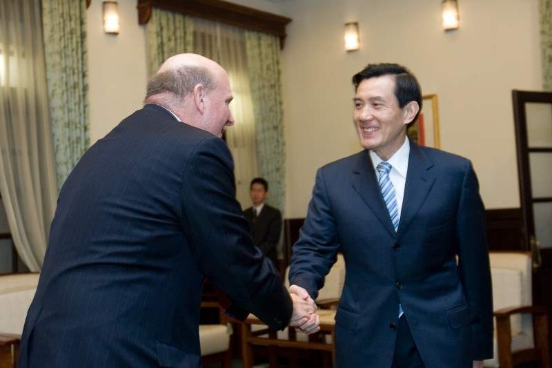 美商微軟公司執行長Steve Ballmer、微軟大中華區董事長梁念堅、台灣微軟總經理蔡恩全等人,上午由經濟部工業局副局長周能傳陪同,前來總統府晉見總統。經濟部長施顏祥、國安會副秘書長何思因也在座。