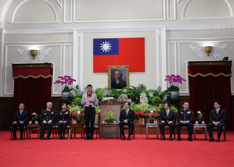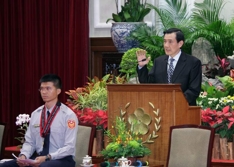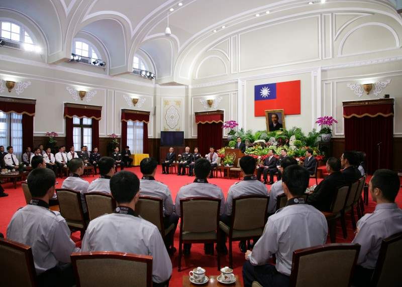 第13屆世界警察消防運動會代表團50餘名團員,下午前來總統府接受總統祝賀,內政部部長江宜樺、警政署署長王卓鈞、移民署署長謝立功、消防署代署長葉吉堂以及關稅總局總局長李長茂也在場陪同。