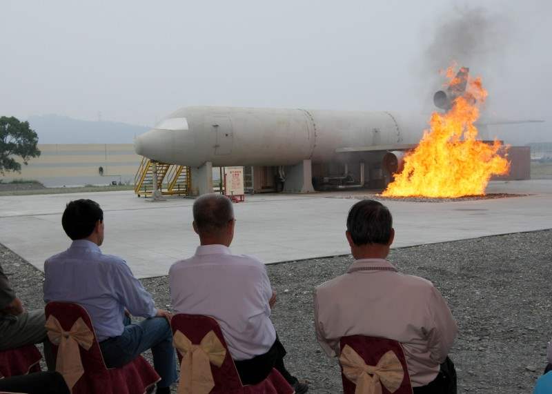 總統等一行人,最後特別參觀航空器火災搶救訓練場。現場設有模擬737機體及火災搶救訓練設施,消防訓練中心先後安排尾翼引擎、機翼引擎及起落架滅火演練,並特別向規劃這項演練的國外技師致意。