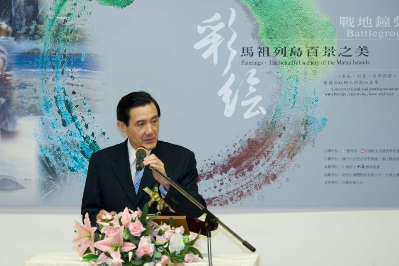 馬英九總統今天下午出席「戰地鐘聲-彩繪馬祖列島百景之美大展」開幕典禮,除與貴賓共同剪綵、應邀致詞外,並駐足觀賞陳列畫作。