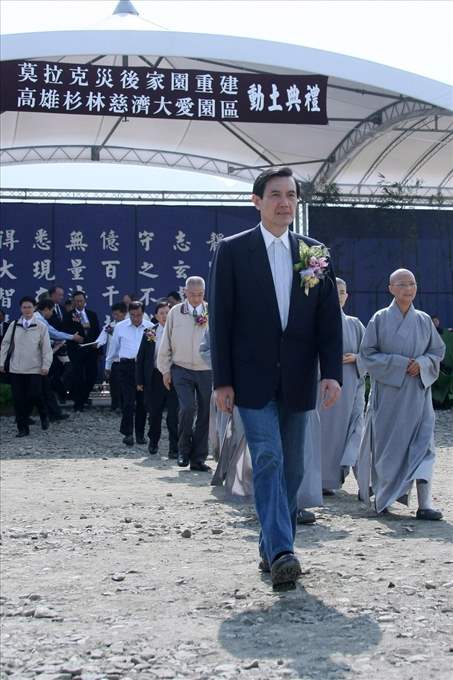 馬英九總統上午前往高雄縣視察八八水災後安置災民永久屋的興建計畫、同時出席「月眉農場永久屋開工動土典禮」,參觀慈濟搭建的原型屋,隨後訪視月眉新小林社區並與鄉民座談。
