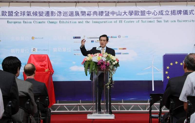 馬英九總統上午出席由國立中山大學所主辦的「歐盟全球氣候變遷暨影像巡迴展」開幕剪彩典禮暨國立中山大學歐盟中心成立揭牌儀式。對來自國內外與會貴賓,他要代表我國政府及人民,表達歡迎之意,同時肯定歐盟致力推動環保理念的努力,願與世界各國共同正視此議題,並預祝展覽順利圓滿成功。