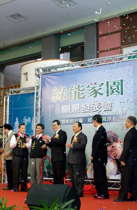 副總統期盼所有宜蘭鄉親與政府共同努力,推動綠能家園在宜蘭實現、營造美好的生活環境,讓宜蘭成為示範城市。他指出,根據行政院綠色能源旭升方案的資料顯示,世界各國提出的「綠色新政」方案總金額已達4,300億美元,全球經濟振興方案未來10年內將再投入近2兆8,000億美元,其中直接與綠能科技產業相關投資約2,120億美元,再生能源投資為380億美元,這是台灣發展的一個契機,而要實現這個夢想,就從宜蘭開始。