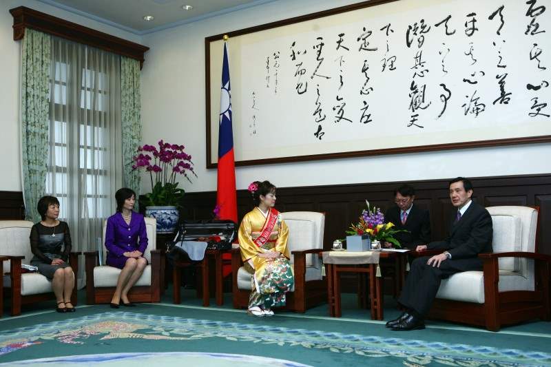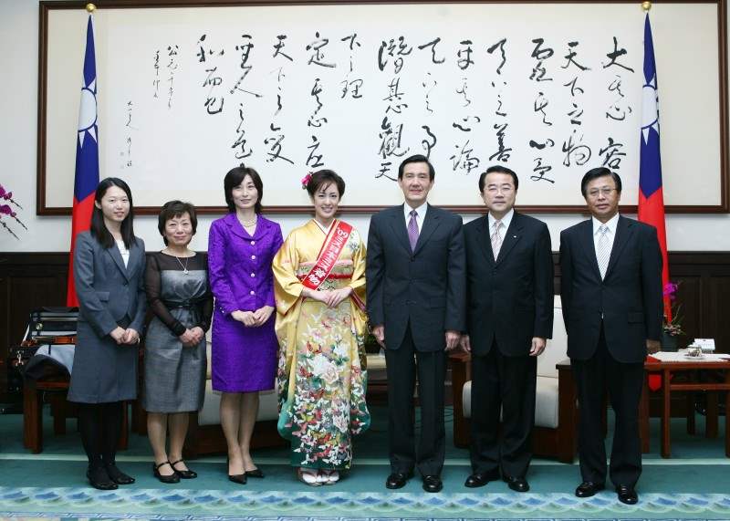 「2009年日本和服小姐」松本蘭女士一行,上午由亞東關係協會秘書長陳調和與日本小姐事務局局長和田優子陪同,前來總統府晉見總統,國安會諮詢委員李嘉進也在座。