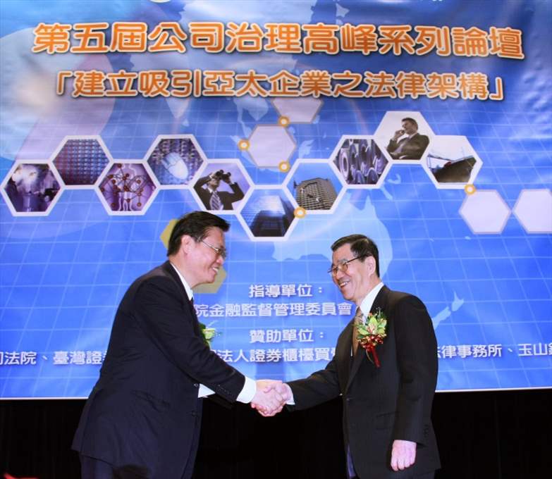 蕭萬長副總統今天上午前往台北福華國際文教會館,出席由中華公司治理協會所舉辦的「第五屆公司治理高峰會論壇」,並以「建立吸引亞太企業之法律架構」發表演說。
