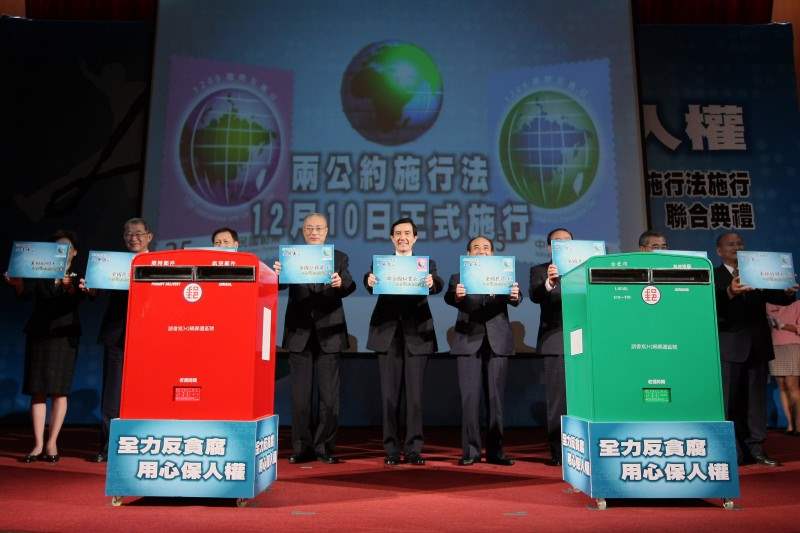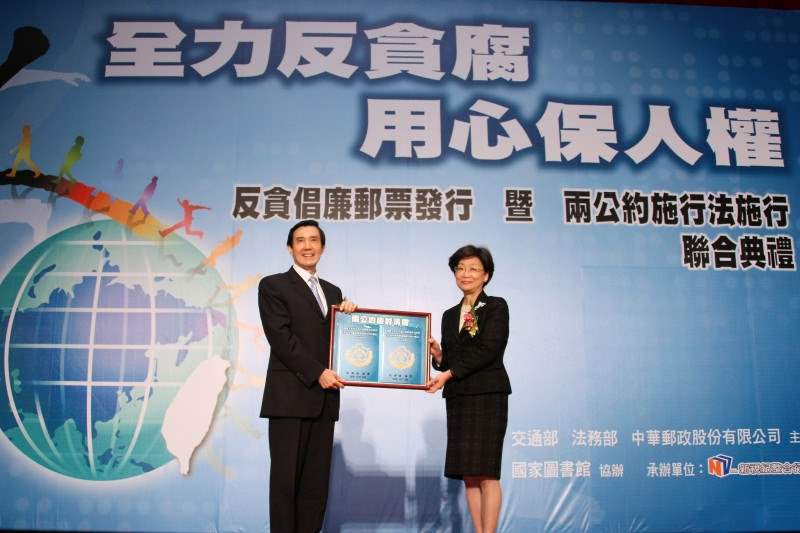 非常高興應邀參加由法務部、交通部、中華郵政及國家圖書館共同舉辦的「全力反貪腐,用心保人權」-反貪倡廉郵票發行暨兩公約施行法施行聯合典禮。今天是「聯合國國際反貪日」,明天(12月10日)是「國際人權日」,這兩個日子對台灣都非常重要。