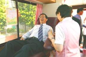 為協助紓緩暑假期間血庫存量短絀情況,陳總統水扁先生今天上午率同總統府同仁一起挽袖捐血,並呼籲國人踴躍捐輸,慷慨奉獻,以作為一個快樂的捐血人為榮。
