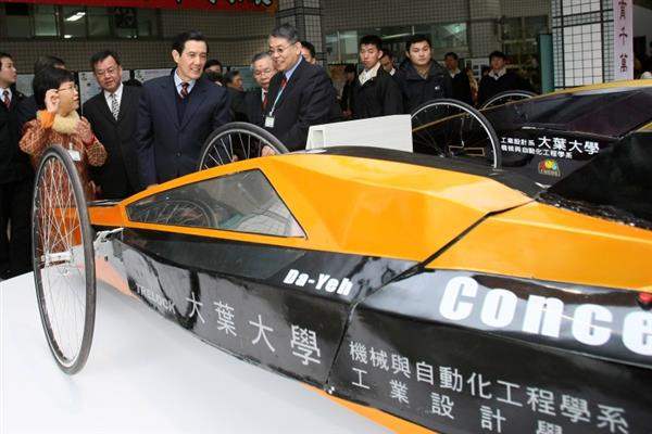 總統表示,大葉大學雖是一所年輕的學校,不過學校從硬體設備到軟體資源都不落人後。學校辦學是以先進車輛科技為特色,歷年來學生參加環保車競賽,連續數年拿下冠軍獎盃,更創下每公升汽油可行駛838.7公里的紀錄保持。當校長跟他說明學校研發的環保省油車,1公升汽油可以跑800多公里,他說真的是「太超過了」。