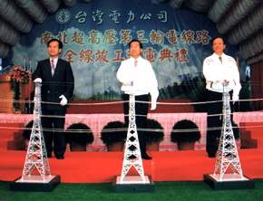 陳總統水扁先生今天上午前往台南縣龍崎鄉超高壓變電所,在經濟部林義夫部長及台灣電力公司林能白董事長的陪同下,主持「南北超高壓第三輸電線路全線竣工通電按鈕儀式」,並應邀致詞。