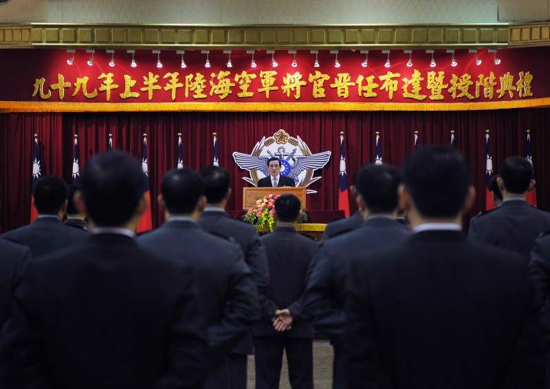 馬英九總統今天上午主持「99年上半年陸海空軍將官晉任佈達暨授階典禮」,除期許國軍發揮「小而精、小而強、小而巧」的精實戰力,加強國際軍事交流、強化官兵體能,以達到「追求和平、預防戰爭」的國防最高境界外,並感謝所有國軍眷屬的支持與辛苦付出。