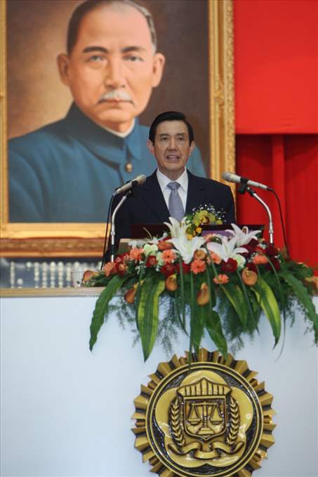 馬英九總統今天上午前往法務部調查局主持「調查班第46期結業典禮」,在頒發結業證書、輔導員榮譽狀及前3名個人獎牌後致詞。