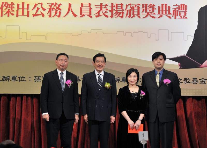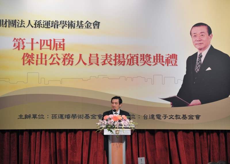 馬英九總統今天上午出席由財團法人孫運璿學術基金會所主辦的「第14屆傑出公務人員表揚頒獎典禮」,親自頒發獎牌給外交部參事俞大雷、檔案局副局長林秋燕及台北市政府法規會主委葉慶元並致詞。