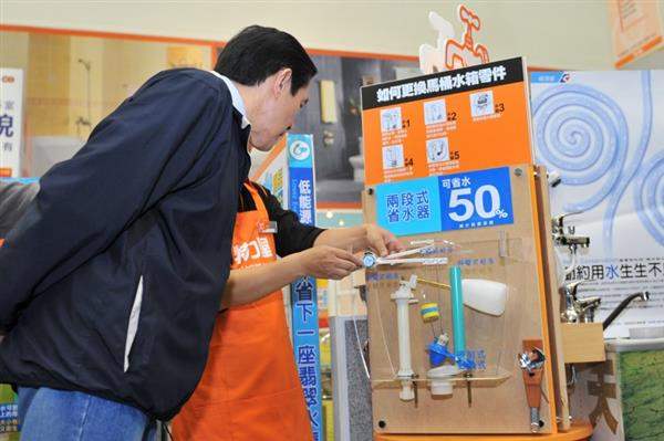 總統表示,南部嚴重缺水,政府展開省水大作戰,節能省水設備變成搶手貨,希望民眾多購買馬桶節水器等有節水標章的商品,而他在台北木柵的老家水龍頭裝有節水裝置,今天在視察完節水標章商品後,他也會要求寓所裝上節水墊片等節水裝置,以節約用水。