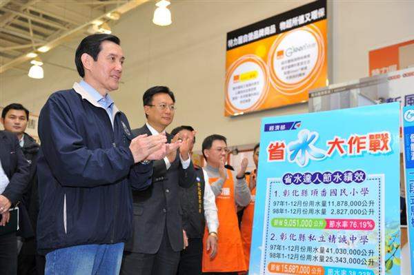 總統在彰化縣長卓伯源、經濟部次長梁國新等人陪同下,先前往彰化縣員林鎮B&Q特力屋大賣場,視察節水標章商品銷售情形,並和彰化頂番國小總務主任蘇朝祥、精誠中學校長賴炳輝分享節水心得。