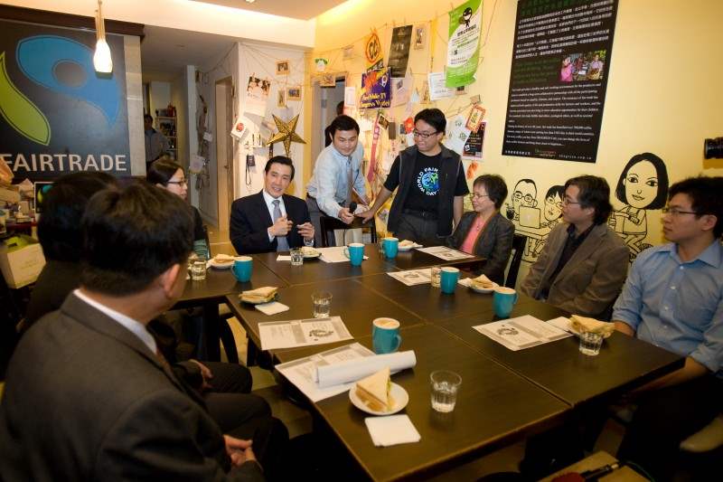 馬英九總統今天中午前往位於台北市杭州南路的「生態綠咖啡」,訪視青年創業的成功實例,對於徐文彥及余宛如兩位年輕人共同創立生態綠咖啡館,勇敢實踐追求公平價值,表示鼓勵;也希望更多人以具體行動關懷農民,一起推動公平貿易(fair trade)理念。