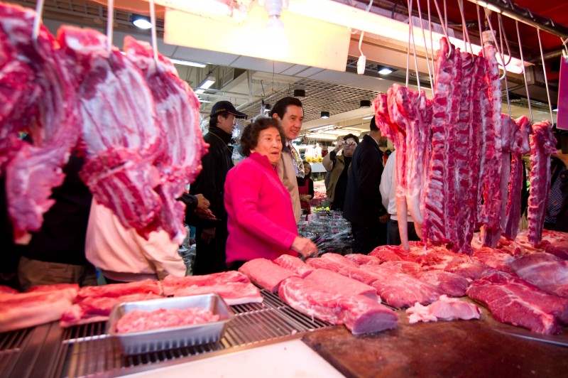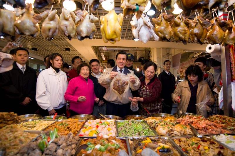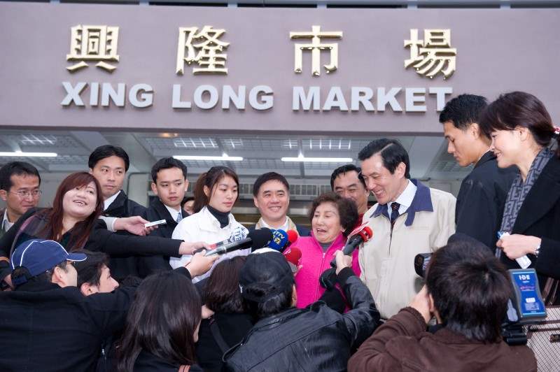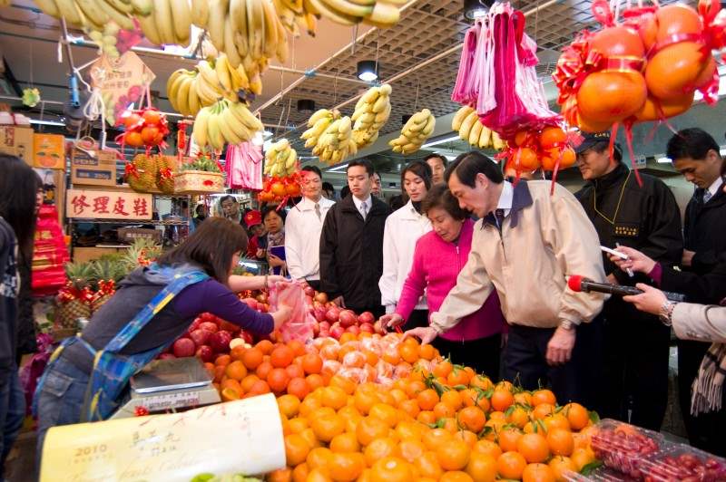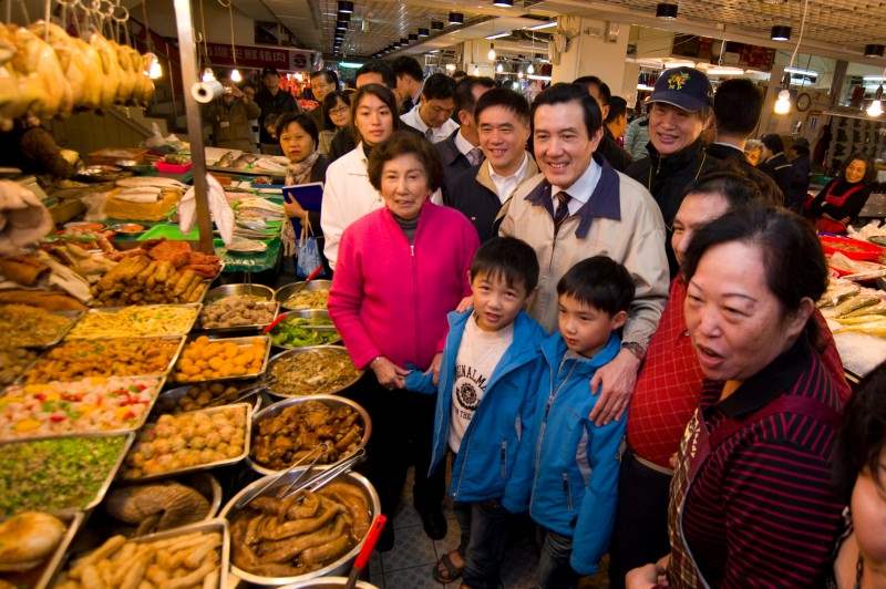 農曆新年即將到來,馬英九總統在台北市長郝龍斌陪同下,一早與母親至文山區興隆市場採買明晚除夕年夜飯食材。