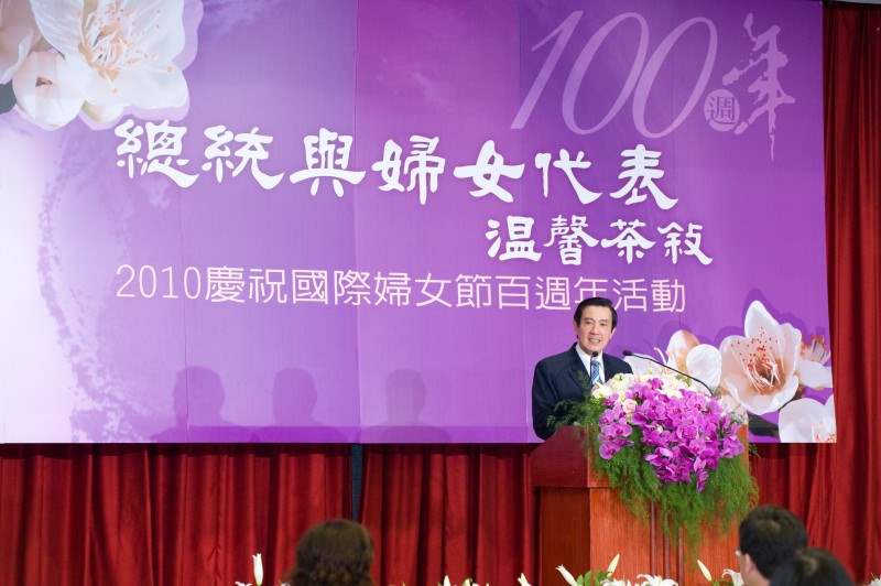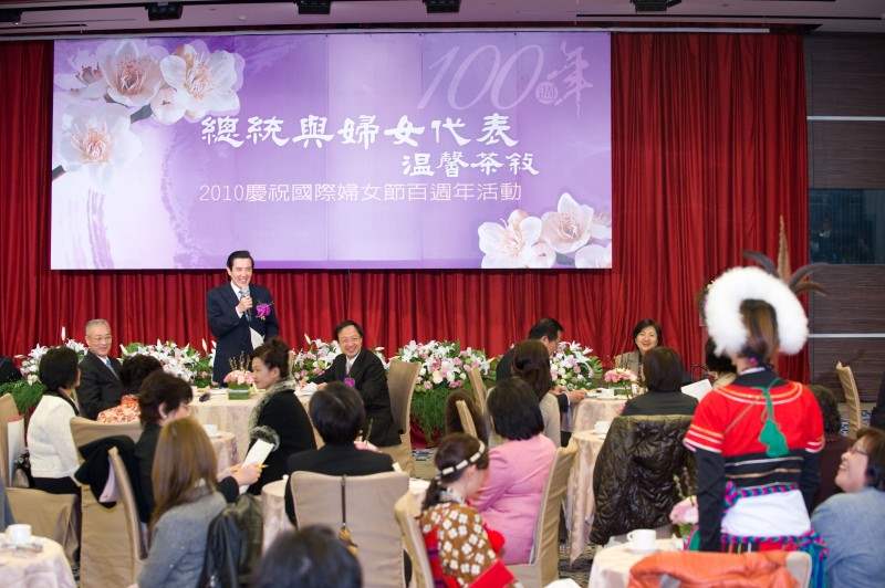 馬英九總統下午出席由內政部舉辦的「總統與婦女代表溫馨茶敘—2010年慶祝國際婦女節100週年活動」。總統肯定及感謝全國婦女同胞們,長期以來為照顧家庭、貢獻社會的全心付出,並祝福全國婦女同胞38婦女節快樂!