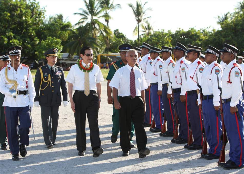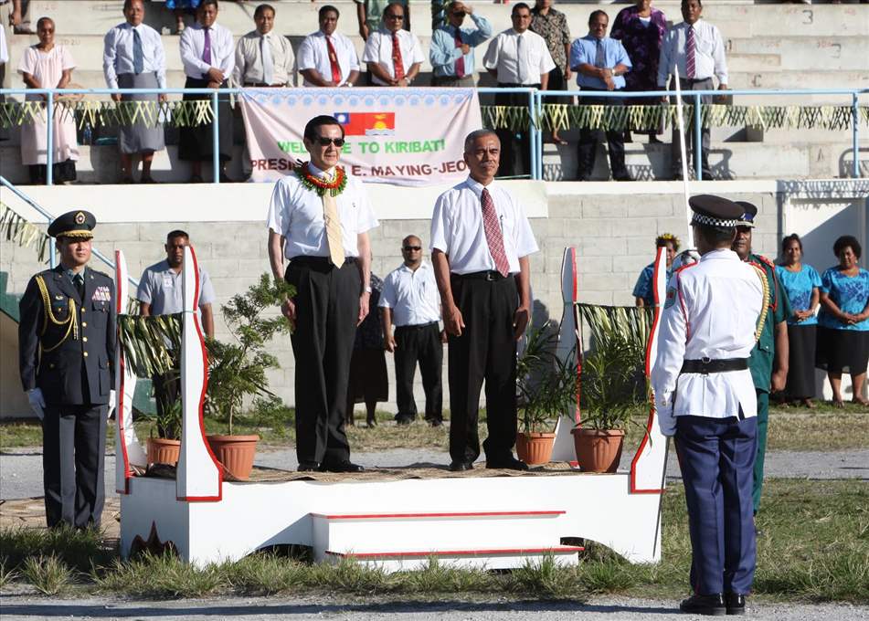 隨後總統前往吉國Bairiki體育場,接受警察儀隊歡迎儀式。吉國總統湯安諾在場歡迎,兩位元首在吉國警察總監引導下,於吉國警察儀隊演奏我國國歌後巡視儀隊,同時向在場熱情歡迎的吉國民眾揮手致意。