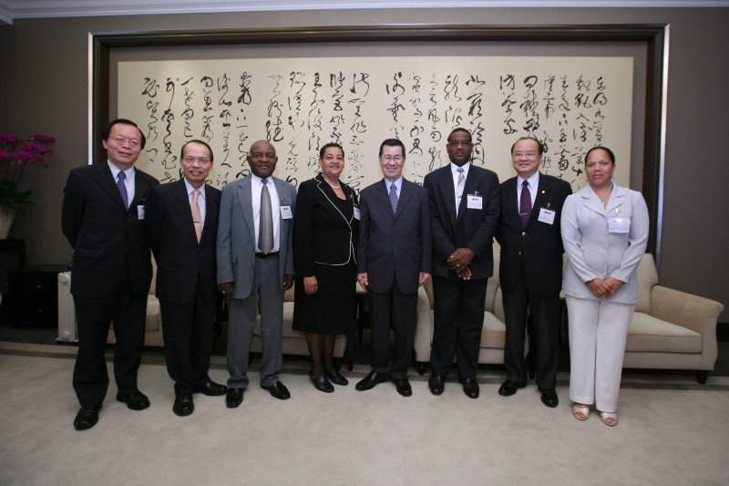 聖露西亞眾議院議長馬修琳暨夫婿一行,上午由該國參議員兼教育文化部副部長夏禮曼(Gaspard Charlemagne)及眾議員康普頓(Jaennine Compton)陪同,前來總統府拜會副總統,外交部次長侯清山也在座。