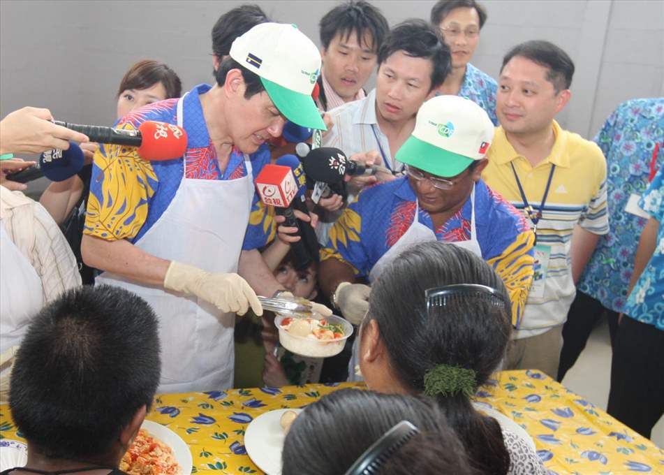 兩國元首與訪團成員在訪視諾魯高中行程中,和在場的諾魯民眾與學童一起用餐,馬總統與史帝芬總統親自為孩童取菜,充分展現親民隨和的作風。餐盒使用的食材都是我國技術團協助諾國民眾栽種,有蕃茄炒蛋、青菜及肉等營養均衡。諾國衛生部長Mathew Batsiua及教育部長Roland Kun偕我技術團團長莫國中,全程陪同並參觀技術團耕作成果。