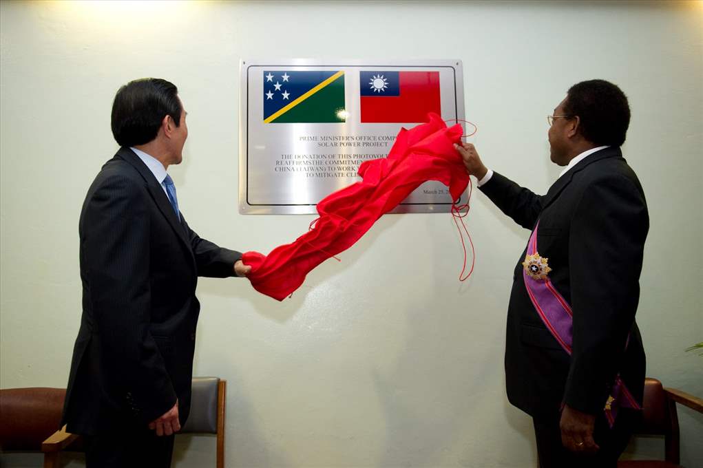 上午進行贈勳儀式時,馬總統由索國總理府秘書長馬瑞雷(Jeremiah Manele)陪同步入總理府內閣會議室,隨即頒贈「特種大綬景星勳章」予西庫瓦總理。儀式結束,並在會議室右側牆前共同主持總理府太陽能供電示範系統揭牌典禮,見證兩國在節能減碳工作上的合作,更向前邁進一步。